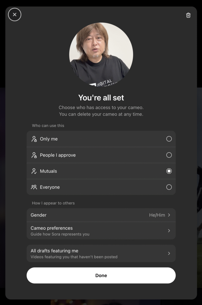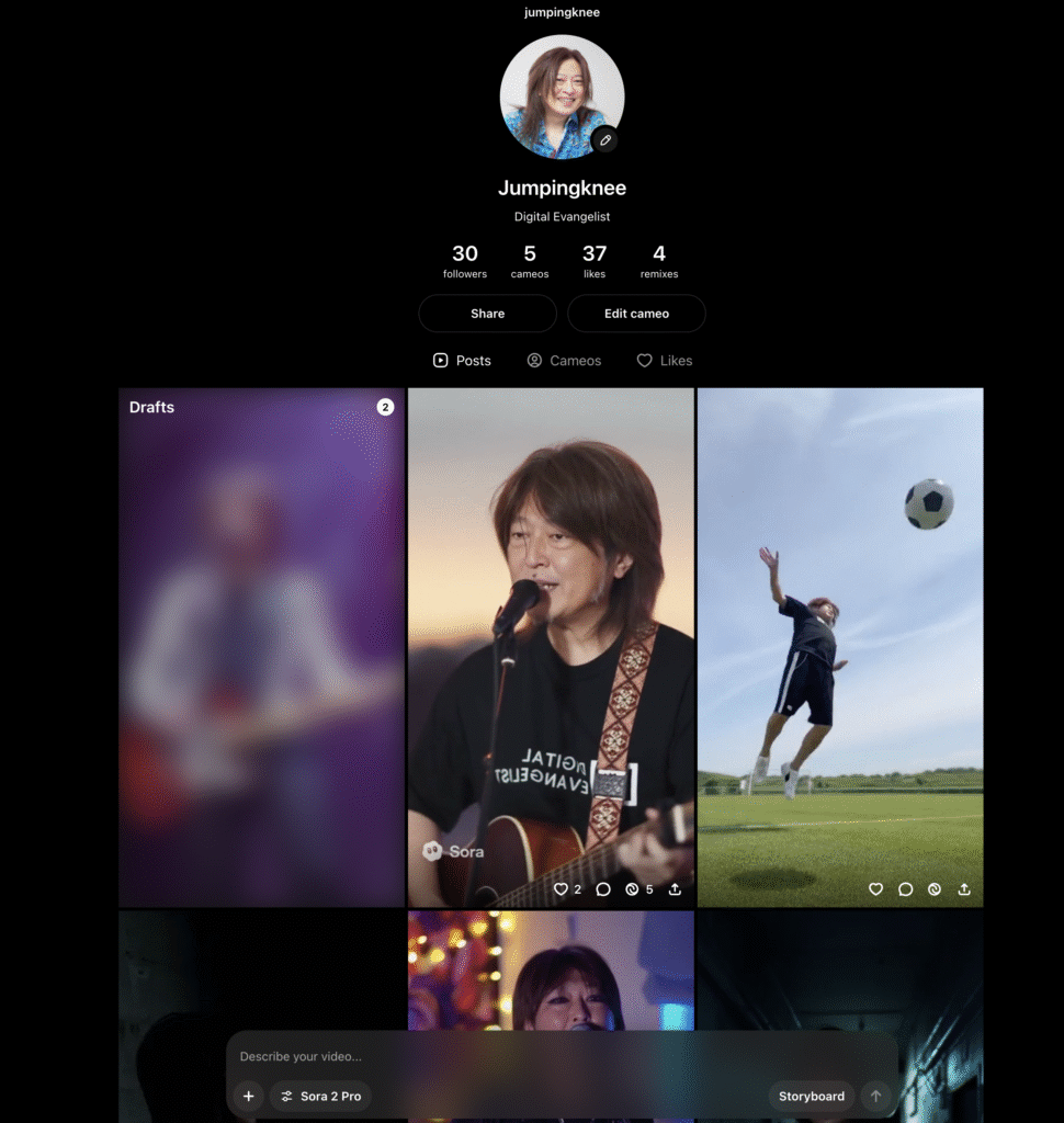 僕も試してみましたが、あまり面白く思わなかったので自分(Sora2ではCameoという)を素材に動画をいくつか作ってみました。これが本当に楽しい。「自分っぽい」んです。かなりの精度。ついにここまできたか、という感じ。