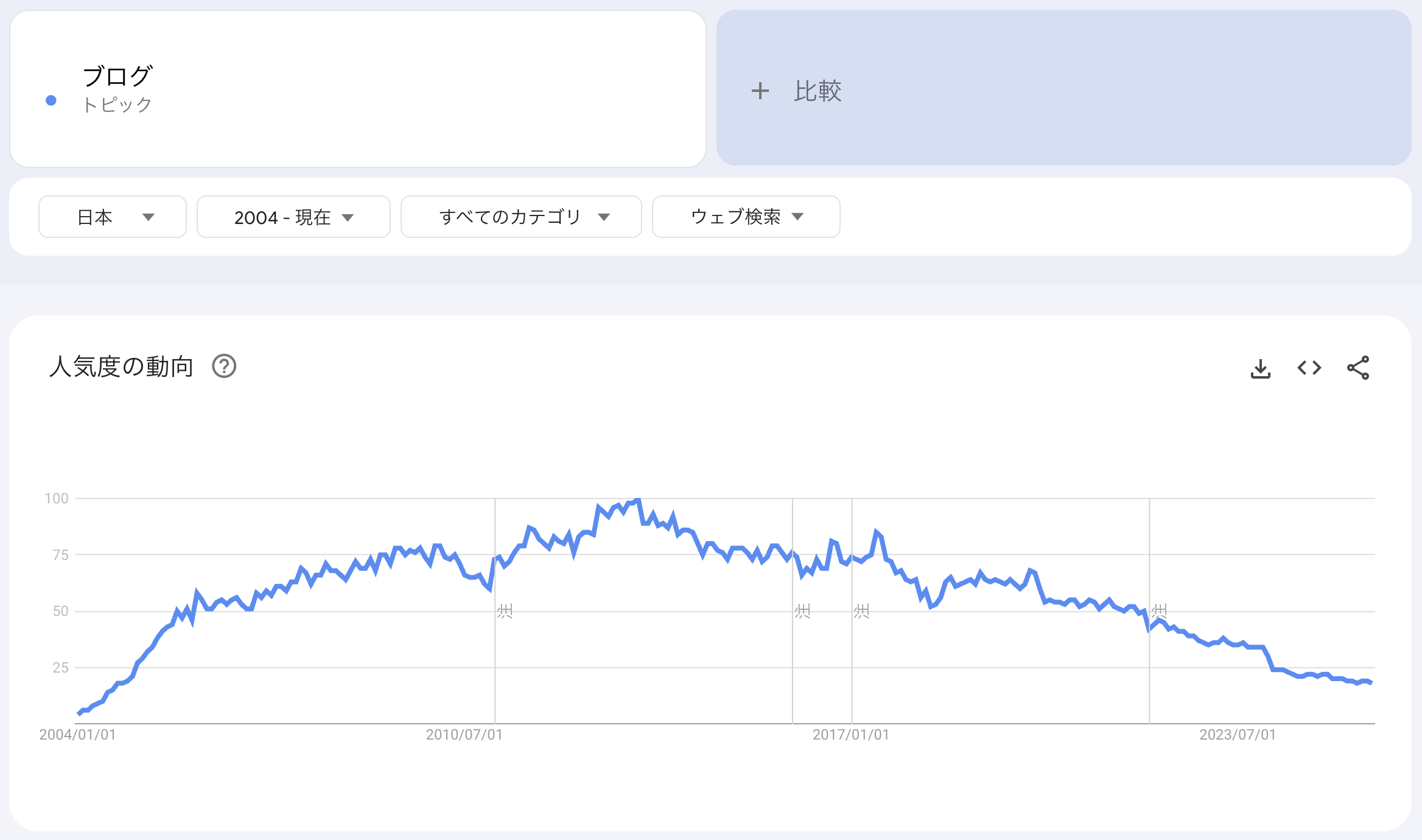 正直、僕も講義をやっていて色々時代の流れを感じる場面はあるのですが、ブログはまさにその1つです。少なくとも、若い方はブログを身近なツールと認識していない方も多いのではないかと思います。実際、Google Trendsで「ブログ」というトピックを調べてみると、2013年あたりをピークに、人気度はどんどん下がってきてますしね。