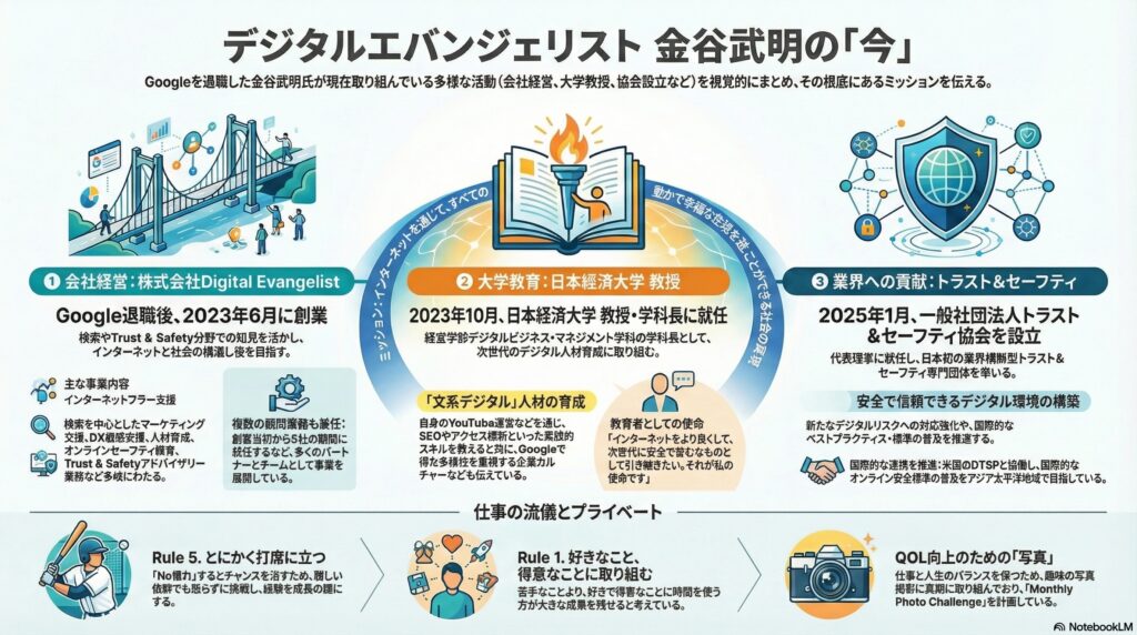 これはぱっと見、素晴らしいですね。僕の就職氷河期から特許事務所時代、SCE時代、Google時代、そして現在に至るまでが分かりやすくまとめられています。特に「今」については、個人会社と大学、社団法人という3つの柱が明確に描かれています。凄い。