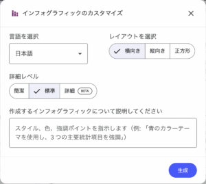 まずは、プロンプト(指示)を何も入力せずに、そのままインフォグラフィックを生成してみました。