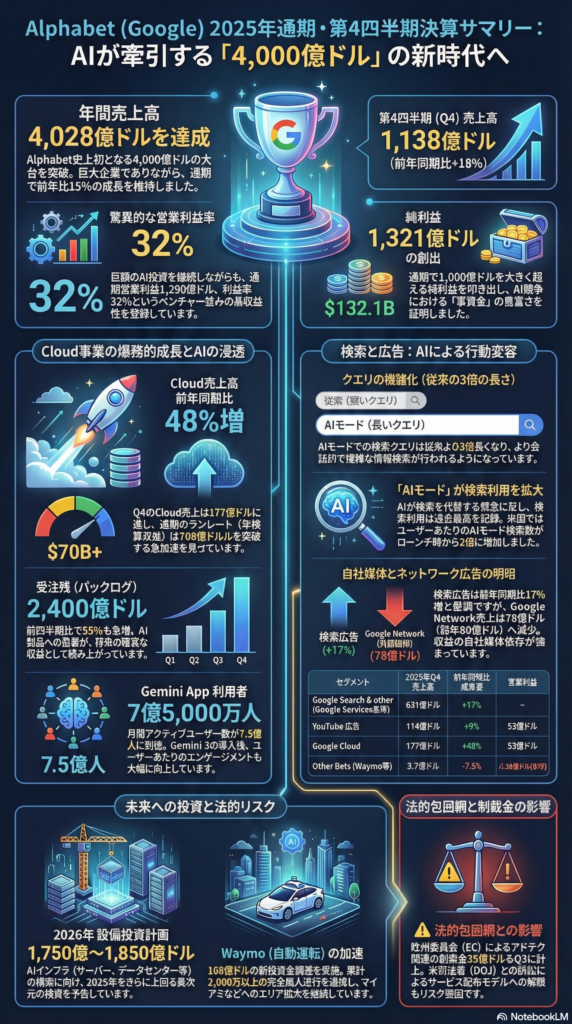 - 投資規模: 潤沢な資金を背景に、2026年の設備投資(CapEx)は 1,750億ドル〜1,850億ドル(約26〜28兆円)を見込む。